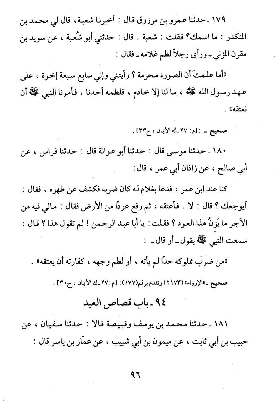 180 - عَنْ زَاذَانَ أَبِي عُمَرَ قَالَ: كُنَّا عِنْدَ ابن عمر رضي الله عنهما فَدَعَا بِغُلَامٍ لَهُ كَانَ ضَربه فَكَشَفَ عَنْ ظهرِه فَقَالَ: أيُوجِعُك؟ قَالَ: لَا، فَأَعْتَقَهُ ثُمَّ رَفَعَ عُودًا مِنَ الْأَرْضِ فَقَالَ: مَالِي فِيهِ مِنَ الْأَجْرِ مَا يَزِنُ هَذَا الْعُودَ. فَقُلْتُ: يَا أَبَا عَبْدِ الرَّحْمَنِ لِمَ تَقُولُ هَذَا؟ قَالَ: سَمِعْتُ النَّبِيَّ صَلَّى اللهُ عَلَيْهِ وَسَلَّمَ يَقُولُ: -أَوْ قَالَ -: (مَنْ ضَرَب مملُوكَه حَداً لَمْ يَأْتِه أَوْ لَطَم وجْهَهُ فَكَّفَارَتُه أَنْ يُعْتِقَه) .