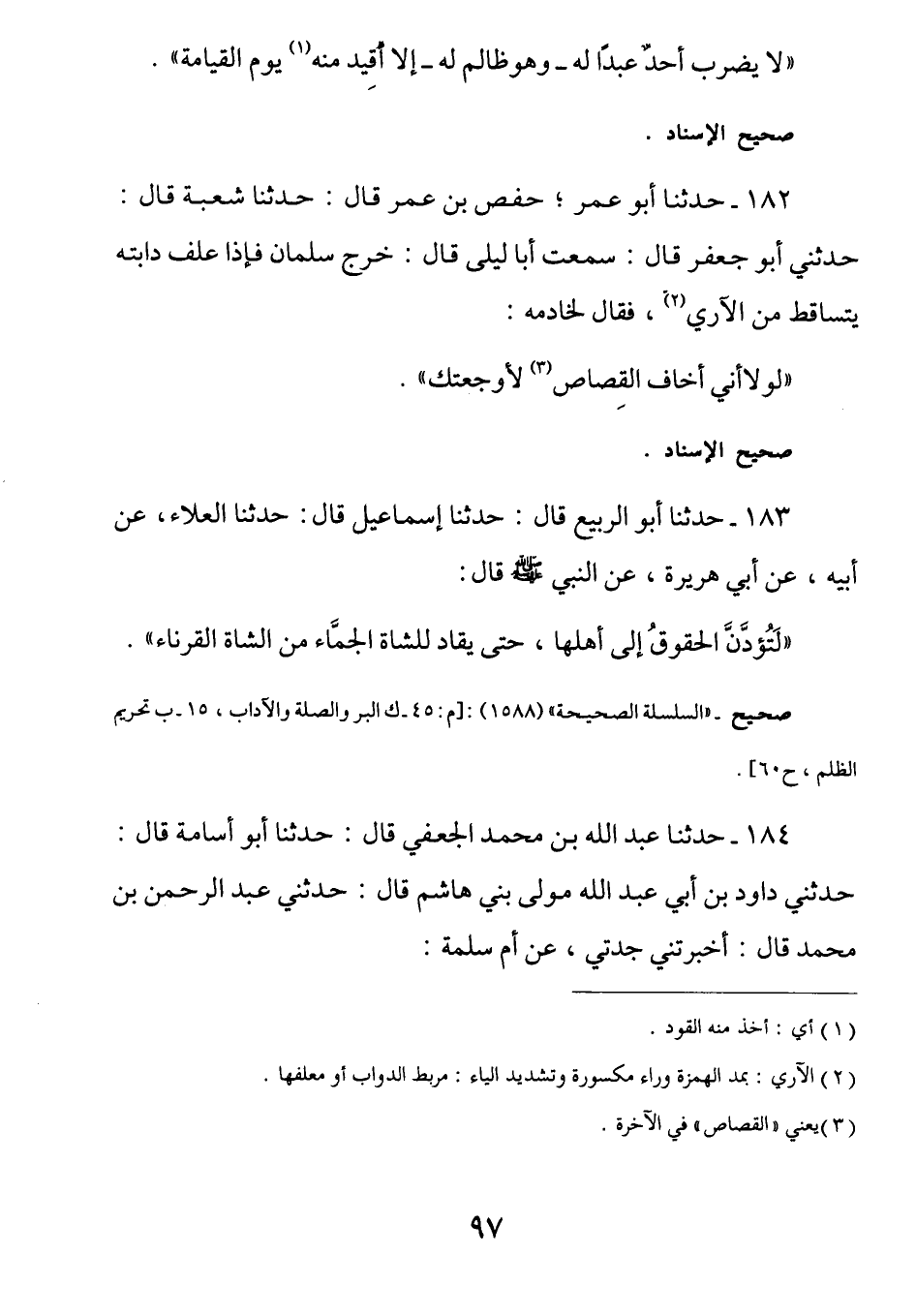 183 - عَنْ أَبِي هُرَيْرَةَ - رَضِيَ اللَّهُ عَنْهُ - عَنِ النَّبِيِّ صَلَّى اللهُ عَلَيْهِ وَسَلَّمَ قَالَ: (لَتُؤدَّنَّ الحقوقُ إِلَى أَهْلِهَا حَتَّى يُقَاد للشاةِ الجَمَّاء (¬2) من الشاة القَرْنَاء) .