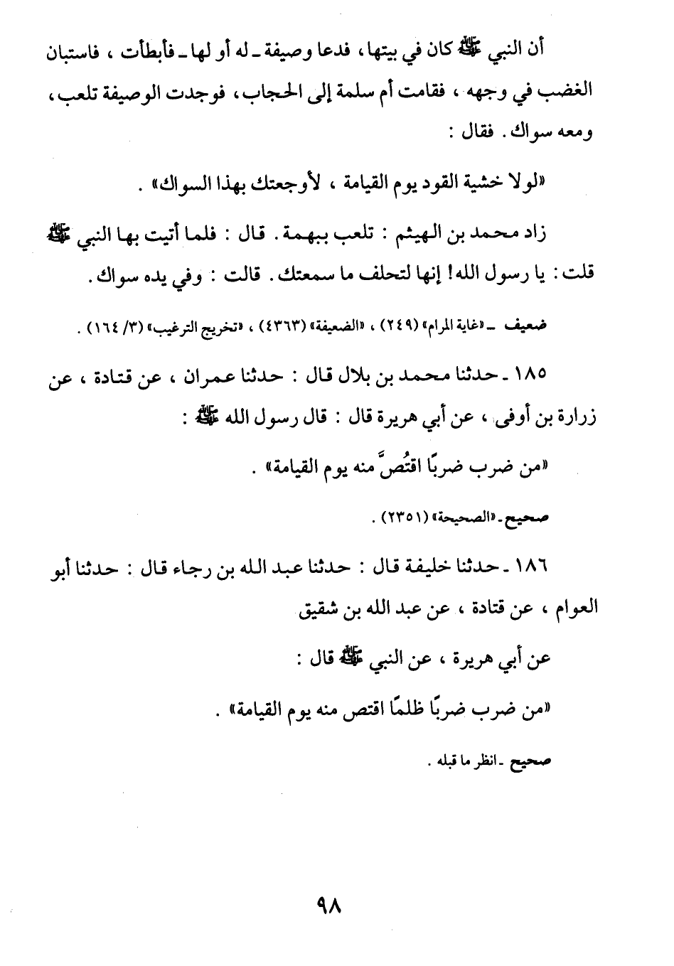 185 - عن أبى هريرة - رضي الله عنه - قَالَ: قَالَ رَسُولُ اللَّهِ صَلَّى اللهُ عَلَيْهِ وَسَلَّمَ: (مَنْ ضَرب ضَرْبًا اقتُصَّ مِنْهُ يَوْمَ القيامة)