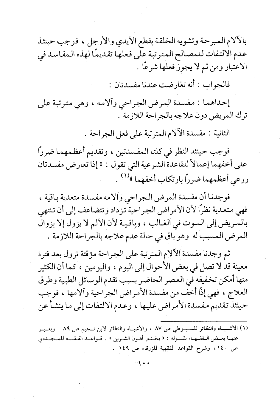 فوجدنا أن مفسدة المرض الجراحي وآلامه مفسدة متعدية باقية، فهي متعدية نظرًا لأن الأمراض الجراحية تزداد وتتضاعف إلى أن تنتهي بالمريض إلى الموت في الغالب، وباقية لأن الألم لا يزول إلا بزوال المرض المسبب له وهو باق في حالة عدم علاجه بالجراحة اللازمة.
