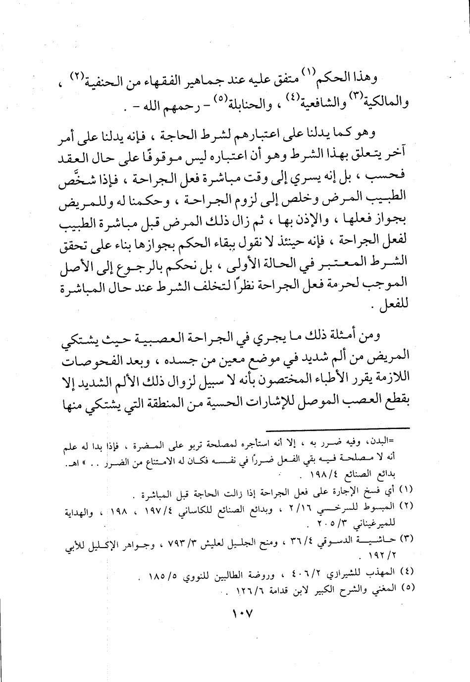 وهو كما يدلنا على اعتبارهم لشرط الحاجة، فإنه يدلنا على أمر آخر يتعلق بهذا الشرط وهو أن اعتباره ليس موقوفًا على حال العقد فحسب، بل إنه يسري إلى وقت مباشرة فعل الجراحة، فإذا شخَّص الطبيب المرض وخلص إلى لزوم الجراحة، وحكمنا له وللمريض بجواز فعلها، والإذن بها، ثم زال ذلك المرض قبل مباشرة الطبيب لفعل الجراحة، فإنه حينئذ لا نقول ببقاء الحكم بجوازها بناء على تحقق الشرط المعتبر في الحالة الأولى، بل نحكم بالرجوع إلى الأصل الموجب لحرمة فعل الجراحة نظرًا لتخلف الشرط عند حال المباشرة للفعل.