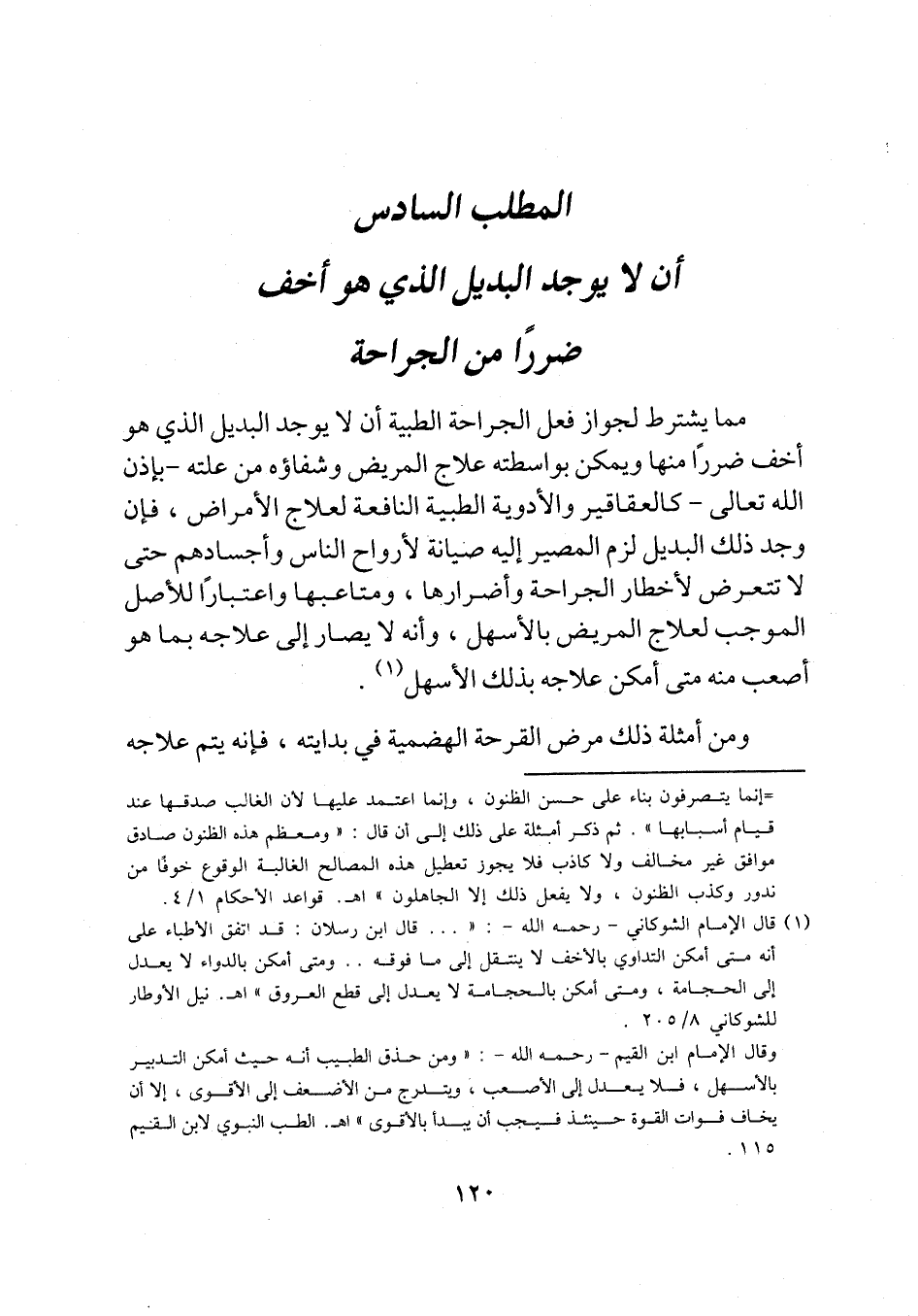 (¬1) قال الإمام الشوكاني -رحمه الله-: " ... قال ابن رسلان: قد اتفق الأطباء على أنه متى أمكن التداوي بالأخف لا ينتقل إلى ما فوقه .. ومتى أمكن بالدواء لا يعدل إلى الحجامة، ومتى أمكن بالحجامة لا يعدل إلى قطع العروق" اهـ. نيل الأوطار للشوكاني 8/ 205.