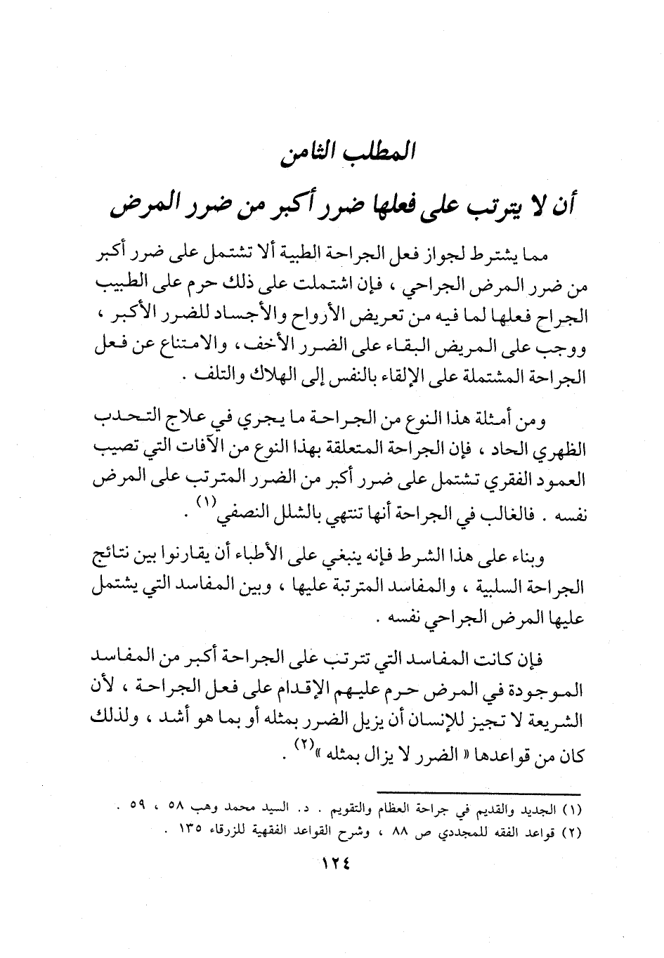 فإن كانت المفاسد التي تترتب على الجراحة أكبر من المفاسد الموجودة في المرض حرم عليهم الإقدام على فعل الجراحة، لأن الشريعة لا تجيز للإنسان أن يزيل الضرر بمثله أو بما هو أشد، ولذلك كان من قواعدها "الضرر لا يزال بمثله" (¬2).