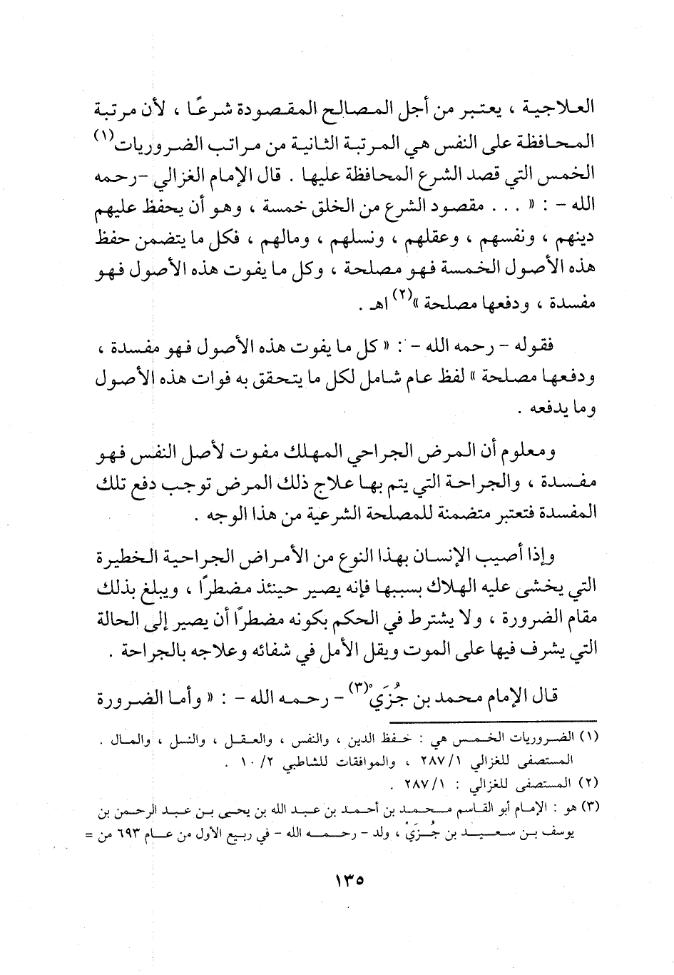 (¬1) الضروريات الخمس هي: حفظ الدين، والنفس، والعقل، والنسل، والمال. المستصفى للغزالي 1/ 287، والموافاقات للشاطبي 2/ 10.