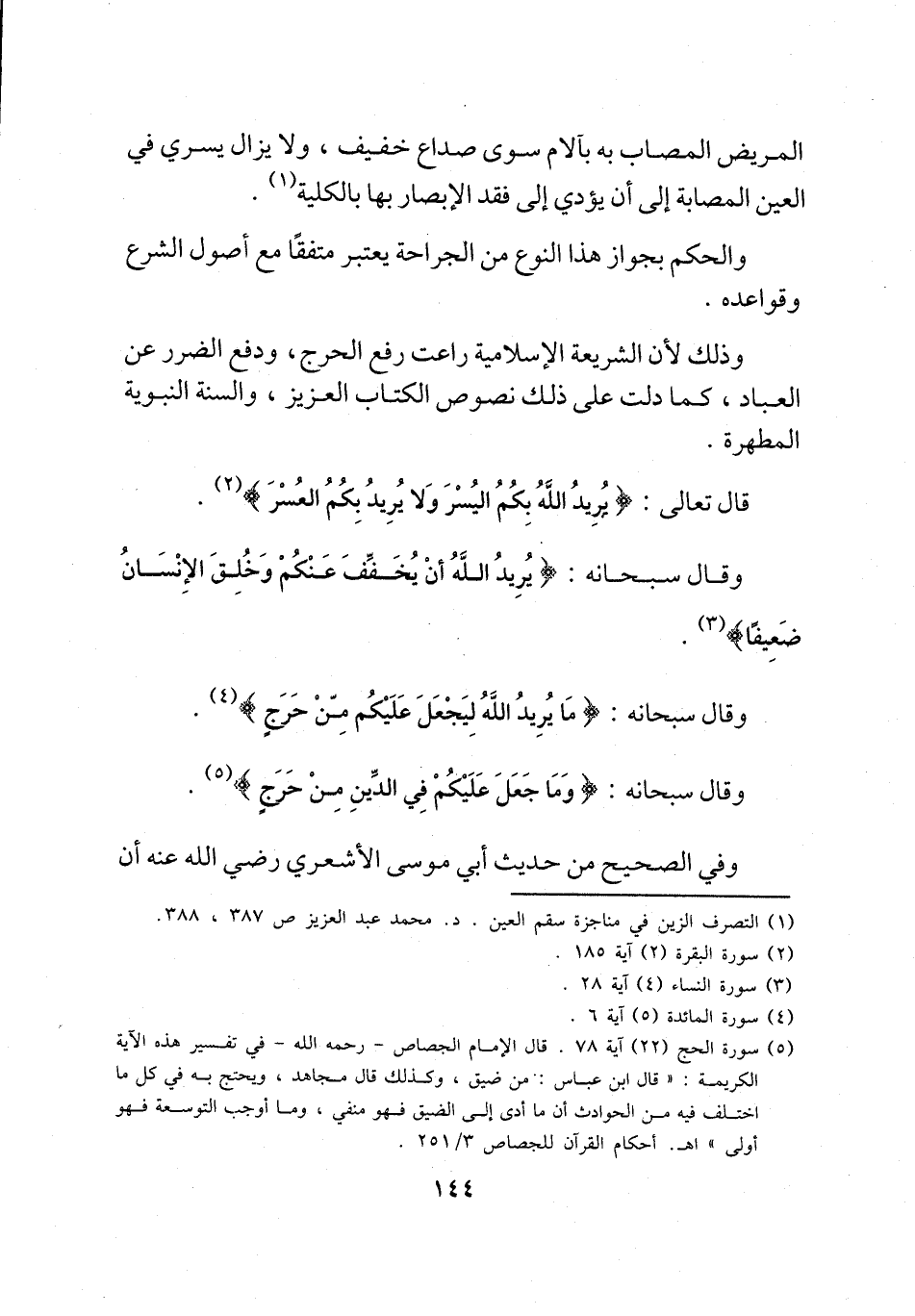 (¬5) سورة الحج (22) آية 78. قال الإمام الجصاص -رحمه الله- في تفسير هذه الآية الكريمة: "قال ابن عباس: من ضيق، وكذلك قال مجاهد، ويحتج به في كل ما اختلف فيه من الحوادث أن ما أدى إلى الضيق فهو منفي، وما أوجب التوسعة فهو أولى" اهـ. أحكام القرآن للجصاص 3/ 251.