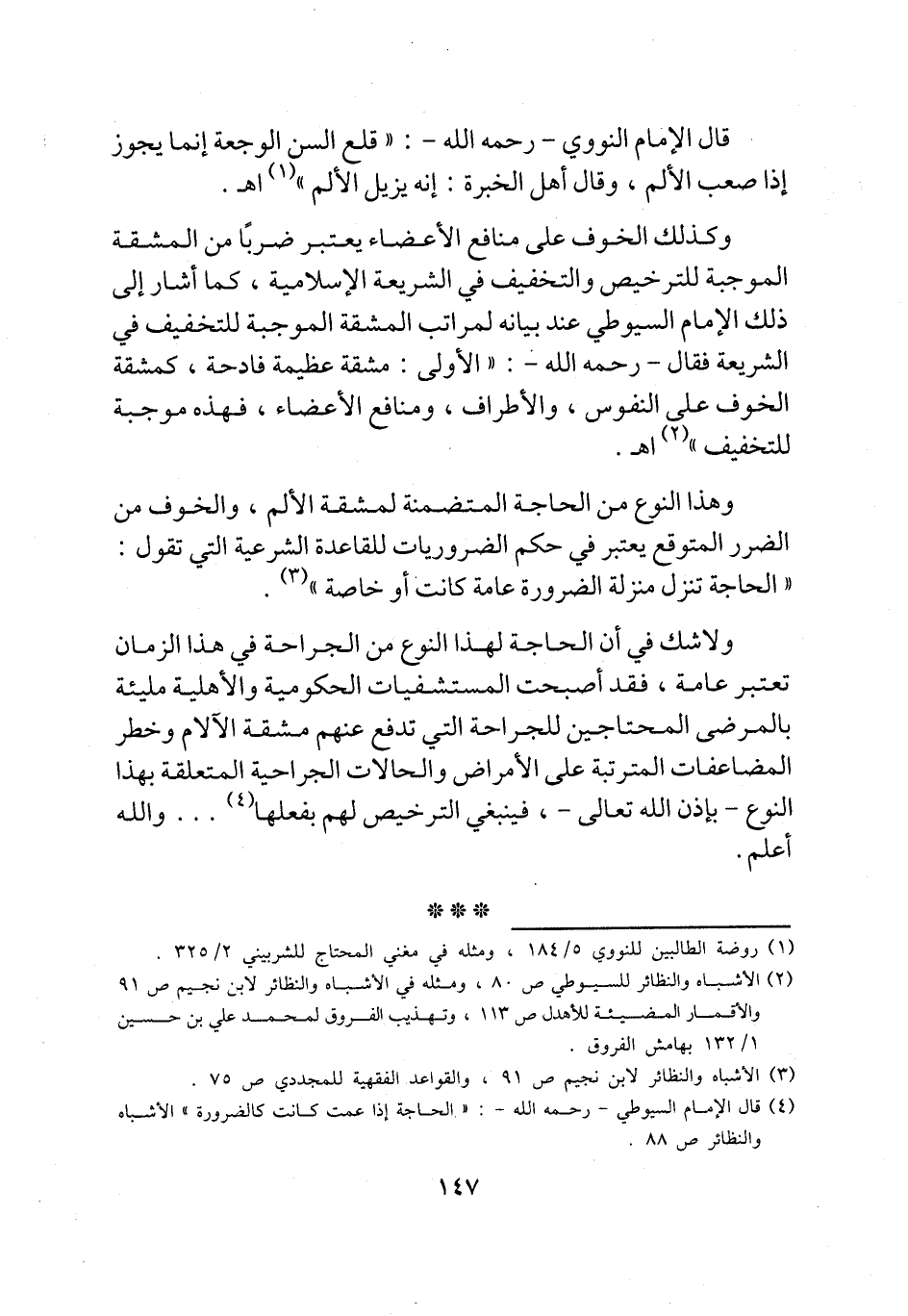 وكذلك الخوف على منافع الأعضاء يعتبر ضربًا من المشقة الموجبة للترخيص والتخفيف في الشريعة الإسلامية، كما أشار إلى ذلك الإمام السيوطي عند بيانه لمراتب المشقة الموجبة للتخفيف في الشريعة فقال -رحمه الله-: "الأولى: مشقة عظيمة فادحة، كمشقة الخوف على النفوس، والأطراف، ومنافع الأعضاء، فهذه موجبة للتخفيف" (¬2) اهـ.