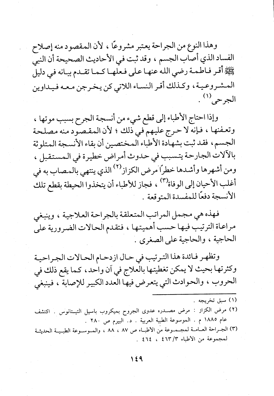 وإذا احتاج الأطباء إلى قطع شيء من أنسجة الجرح بسبب موتها، وتعفنها، فإنه لا حرج عليهم في ذلك؛ لأن المقصود منه مصلحة الجسم، فقد ثبت بشهادة الأطباء المختصين أن بقاء الأنسجة المتلوثة بالآلات الجارحة يتسبب في حدوث أمراض خطيرة في المستقبل، ومن أشهرها وأشدها خطراً مرض الكزاز (¬2) الذي ينتهي بالمصاب به في أغلب الأحيان إلى الوفاة (¬3)، فجاز للأطباء أن يتخذوا الحيطة بقطع تلك الأنسجة دفعًا للمفسدة المتوقعة.
