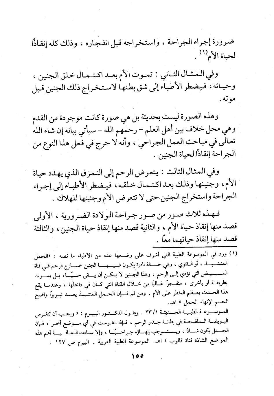 (¬1) ورد في الموسوعة الطبية التي أشرف على وضعها عدد من الأطباء ما نصه: "الحمل المنتبذ، أو القنوي، وهي حالة نادرة يكون فيها الجنين خارج الرحم في قناة المبيض التي تؤدي إلى الرحم، وهذا الجنين لا يمكن أن يبقى حياً، بل يموت بطريقة أو بأخرى، منفجرًا غالبًا من خلال القناة التي كان في داخلها، وعندما يقع هذا الحدث يعظم الخطر على الأم، ومن ثم فإن الحمل المنتبذ يعد تبريرًا واضح الحسم لإنهاء الحمل" اهـ.