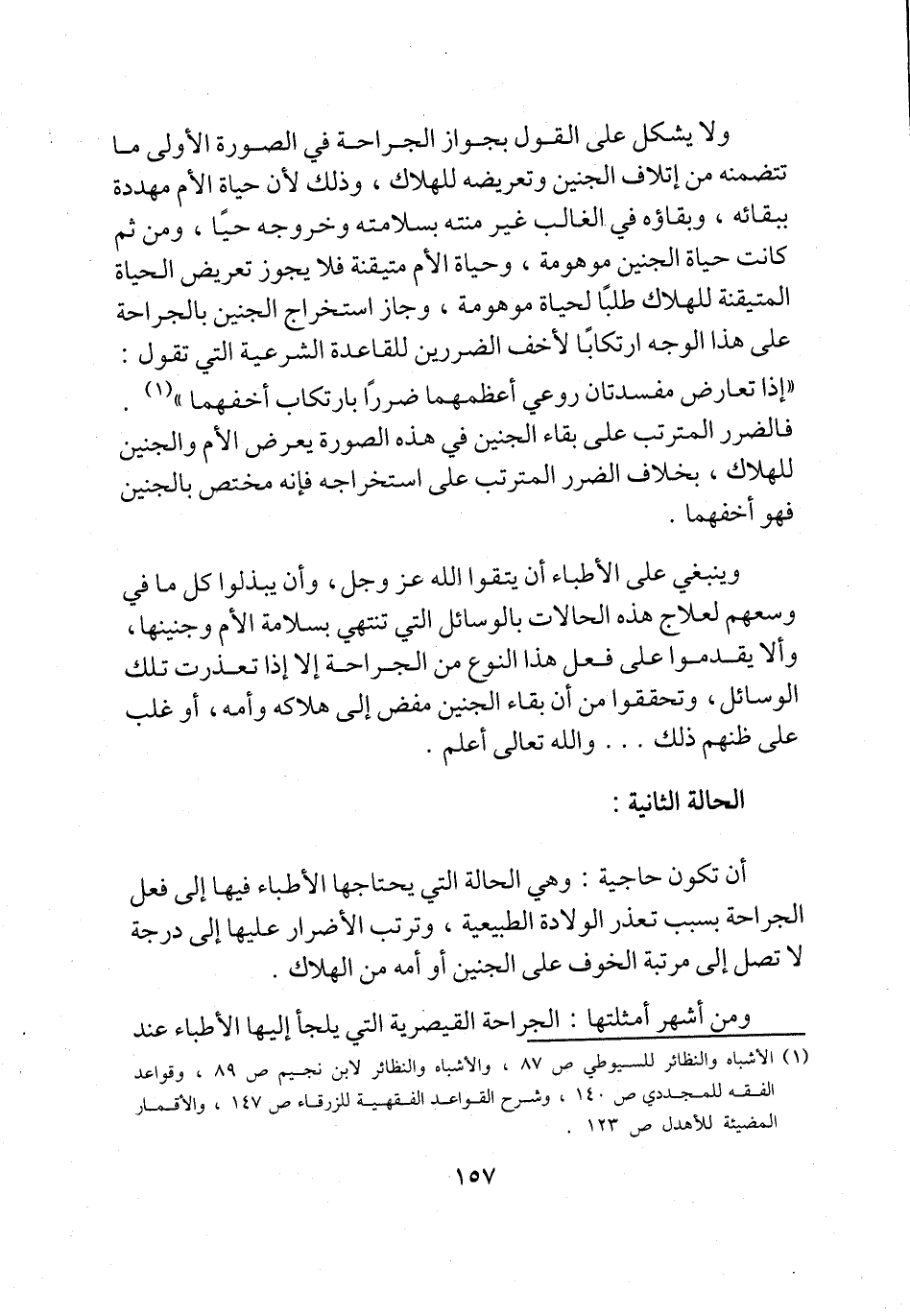 ولا يشكل على القول بجواز الجراحة في الصورة الأولى ما تتضمنه من إتلاف الجنين وتعريضه للهلاك، وذلك لأن حياة الأم مهددة ببقائه، وبقاؤه في الغالب غير منته بسلامته وخروجه حيًا، ومن ثم كانت حياة الجنين موهومة، وحياة الأم متيقنة فلا يجوز تعريض الحياة المتيقنة للهلاك طلبًا لحياة موهومة، وجاز استخراج الجنين بالجراحة على هذا الوجه ارتكابًا لأخف الضررين للقاعدة الشرعية التي تقول: "إذا تعارض مفسدتان روعي أعظمهما ضرراً بارتكاب أخفهما" (¬1).