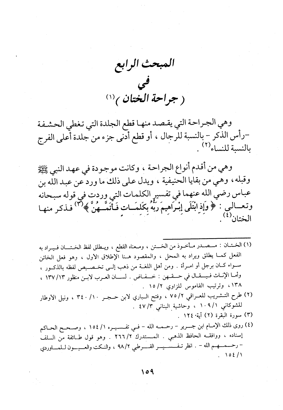 (¬1) الختان: مصدر مأخوذ من الختن، ومعناه القطع، ولطلق لفظ الختان فيراد به الفعل كما يطلق ويراد به المحل، والمقصود هنا الإطلاق الأول، وهو فعل الخاتن سواء كان برجل أو امرأة. ومن أهل اللغة من ذهب إلى تخصيص لفظه بالذكور، وأما الإناث فيقال في حقهن: خفاض. لسان العرب لابن منظور 13/ 137، 138، وترتيب القاموس للزاوي 2/ 15.