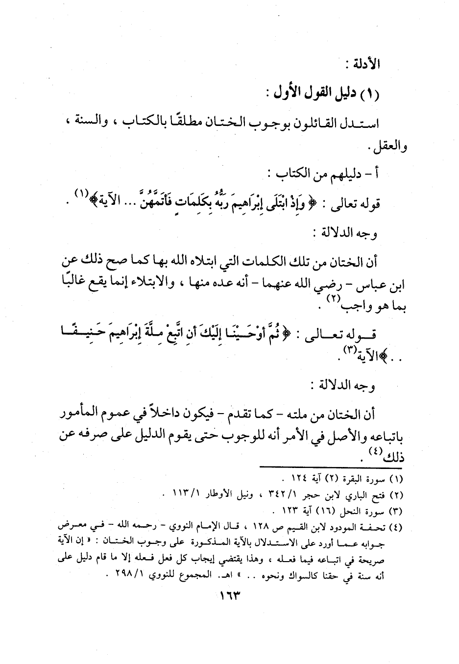 (¬4) تحفة المودود لابن القيم ص 128، قال الإمام النووي -رحمه الله- في معرض جوابه عما أورد على الاستدلال بالآية المذكورة على وجوب الختان: "إن الآية صريحة في اتباعه فيما فعله، وهذا يقتضي إيجاب كل فعل فعله إلا ما قام دليل على أنه سنة في حقنا كالسواك ونحوه .. " اهـ. المجموع للنووي 1/ 298.