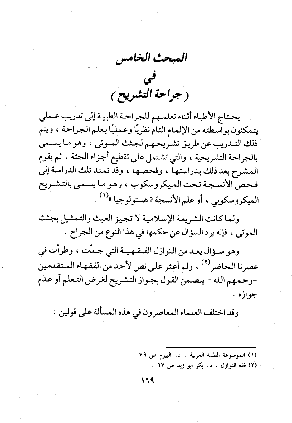 وهو سؤال يعد من النوازل الفقهية التي جدّت، وطرأت في عصرنا الحاضر (¬2)، ولم أعثر على نص لأحد من الفقهاء المتقدمين -رحمهم الله- يتضمن القول بجواز التشريح لغرض التعلم أو عدم جوازه.
