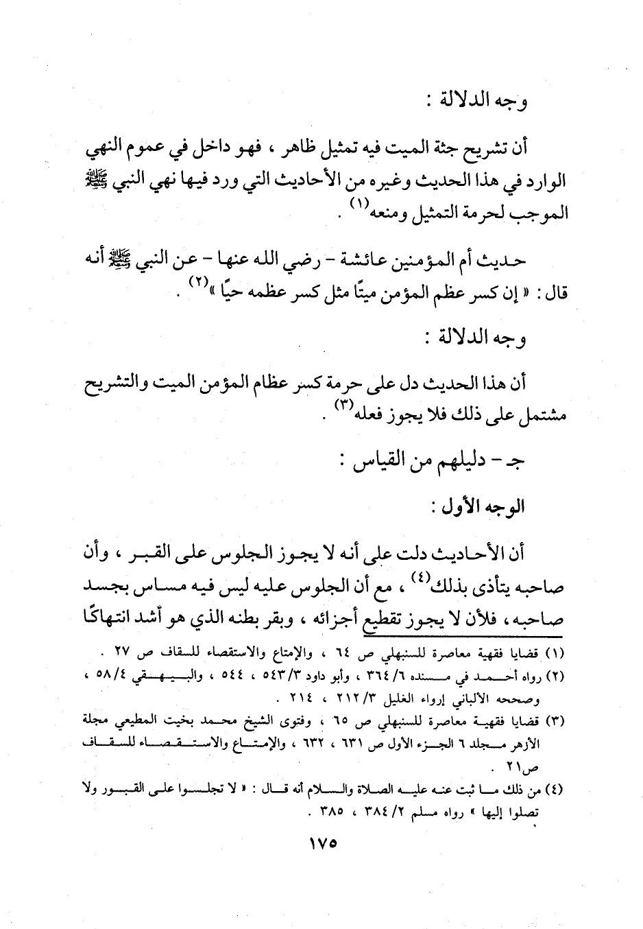 حديث أم المؤمنين عائشة -رضي الله عنها- عن النبي - صلى الله عليه وسلم - أنه قال: "إن كسر عظم المؤمن ميتاً مثل كسر عظمه حيًا" (¬2).