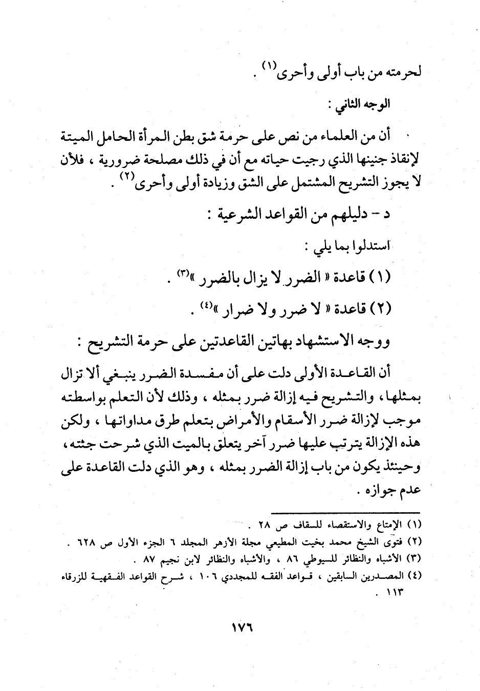 أن من العلماء من نص على حرمة شق بطن المرأة الحامل الميتة لإنقاذ جنينها الذي رجيت حياته مع أن في ذلك مصلحة ضرورية، فلأن لا يجوز التشريح المشتمل على الشق وزيادة أولى وأحرى (¬2).