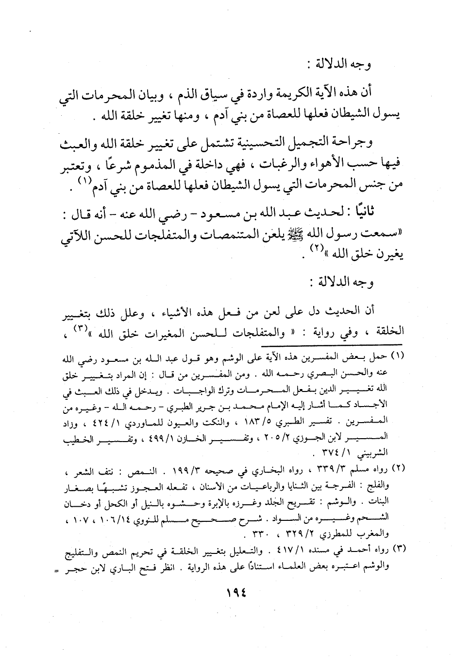 (¬3) رواه أحمد في مسنده 1/ 417، والتعليل بتغيير الخلقة في تحريم النمص والتفليج والوشم اعتبره بعض العلماء استنادًا على هذه الرواية. انظر فتح الباري لابن حجر =