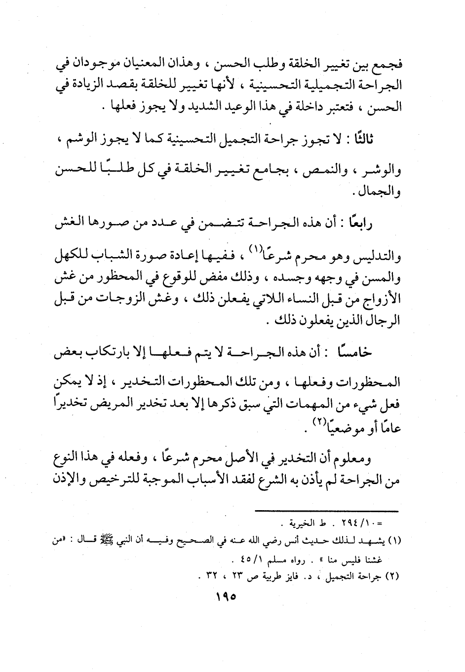 ثالثًا: لا تجوز جراحة التجميل التحسينية كما لا يجوز الوشم، والوشر، والنمص، بجامع تغيير الخلقة في كل طلبًا للحسن والجمال.