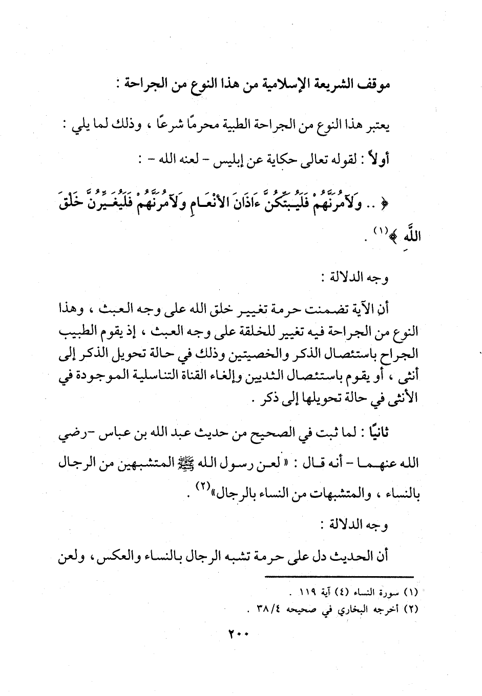 أن الآية تضمنت حرمة تغيير خلق الله على وجه العبث، وهذا النوع من الجراحة فيه تغيير للخلقة على وجه العبث، إذ يقوم الطبيب الجراح باستئصال الذكر والخصيتين وذلك في حالة تحويل الذكر إلى أنثى، أو يقوم باستئصال الثديين وإلغاء القناة التناسلية الموجودة في الأنثى في حالة تحويلها إلى ذكر.