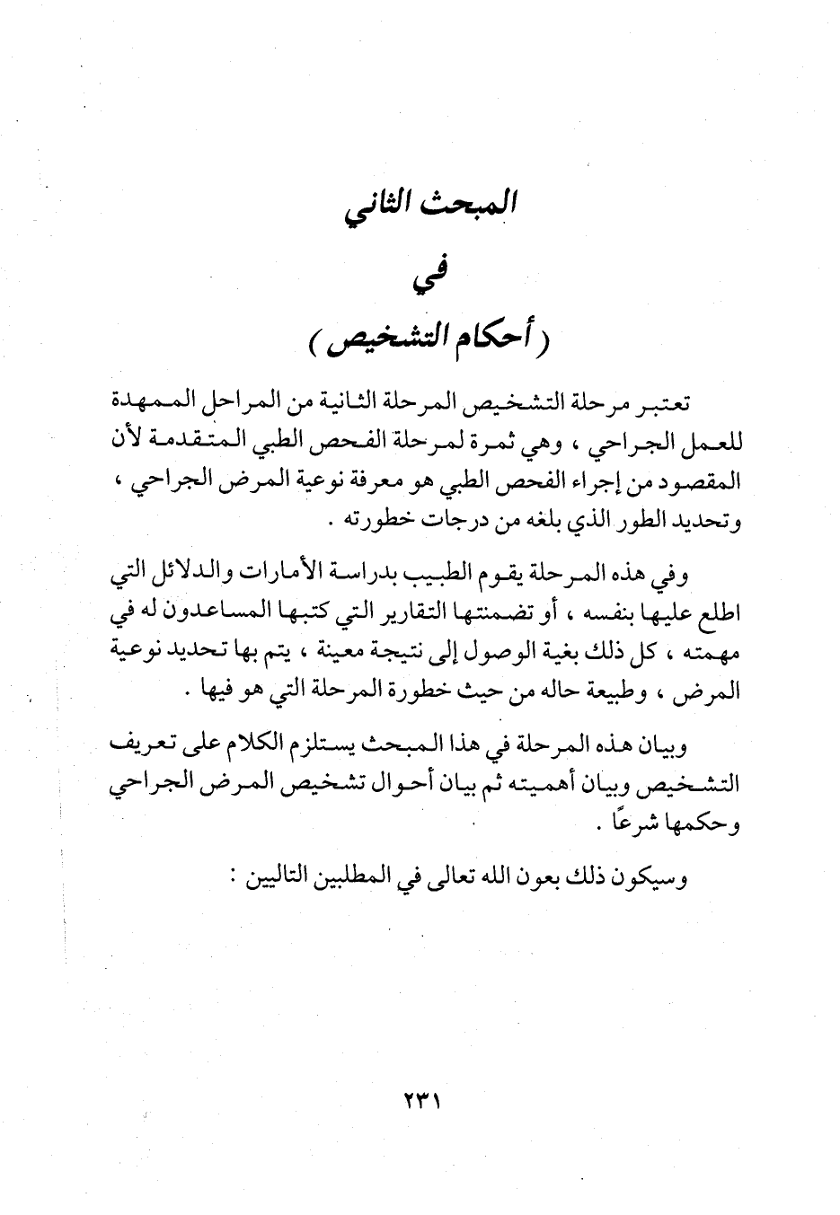 وبيان هذه المرحلة في هذا المبحث يستلزم الكلام على تعريف التشخيص وبيان أهميته ثم بيان أحوال تشخيص المرض الجراحي وحكمها شرعًا.