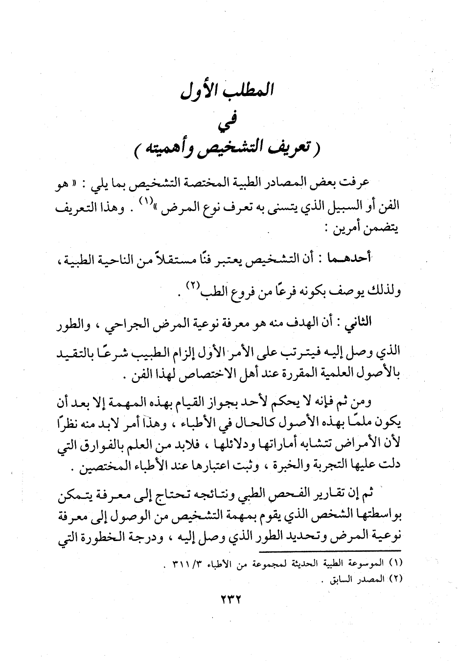 أحدهما: أن التشخيص يعتبر فنًا مستقلاً من الناحية الطبية، ولذلك يوصف بكونه فرعًا من فروع الطب (¬2).