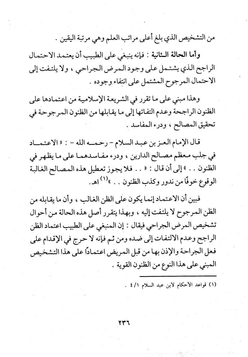 فبين أن الاعتماد إنما يكون على الظن الغالب، وأن ما يقابله من الظن المرجوح لا يلتفت إليه، وبهذا يتقرر أصل هذه الحالة من أحوال تشخيص المرض الجراحي فيقال: إن المنبغي على الطبيب اعتماد الظن الراجح وعدم الالتفات إلى ضده ومن ثم فإنه لا حرج في الإقدام على فعل الجراحة والإذن بها من قبل المريض اعتمادًا على هذا التشخيص المبني على هذا النوع من الظنون القوية.