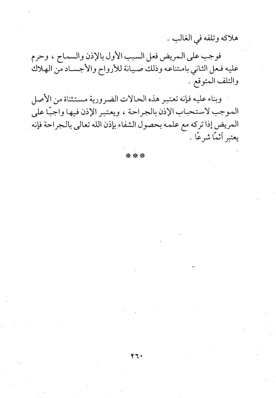 فوجب على المريض فعل السبب الأول بالإذن والسماح، وحرم عليه فعل الثاني بامتناعه وذلك صيانة للأرواح والأجساد من الهلاك والتلف المتوقع.