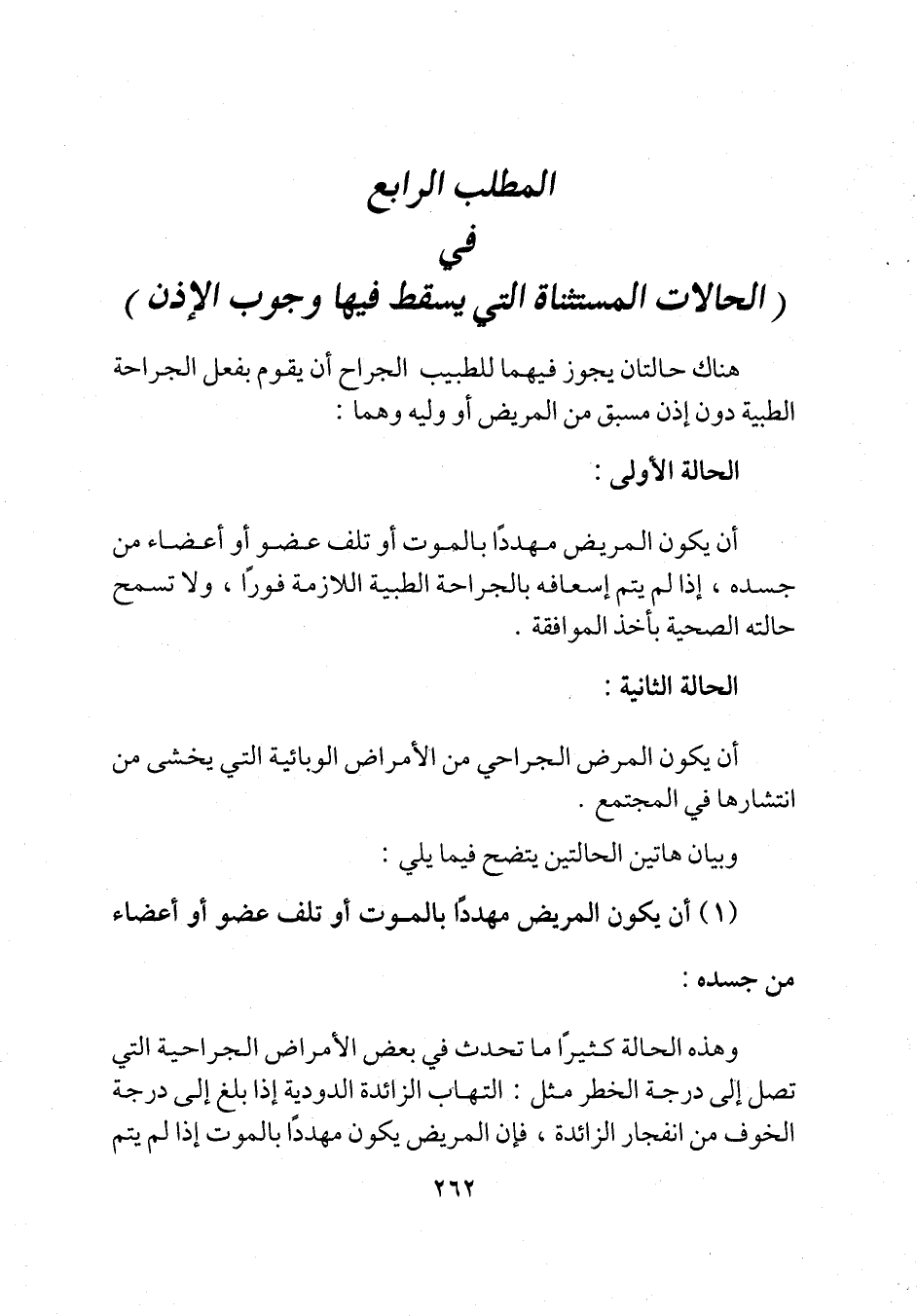 أن يكون المريض مهددًا بالموت أو تلف عضو أو أعضاء من جسده، إذا لم يتم إسعافه بالجراحة الطبية اللازمة فورًا، ولا تسمح حالته الصحية بأخذ الموافقة.
