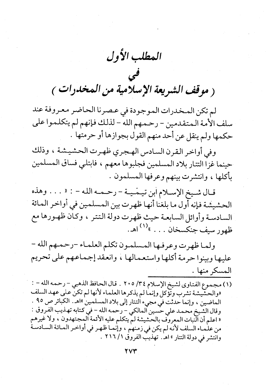 (¬1) مجموع الفتاوى لشيخ الإسلام 34/ 205. قال الحافظ الذهبي -رحمه الله-: "والحشيشة تشرب وتؤكل وإنما لم يذكرها العلماء لأنها لم تكن على عهد السلف الماضين، وإنما حدثت في مجيء التتار إلى بلاد المسلمين "اهـ. الكبائر ص 95.