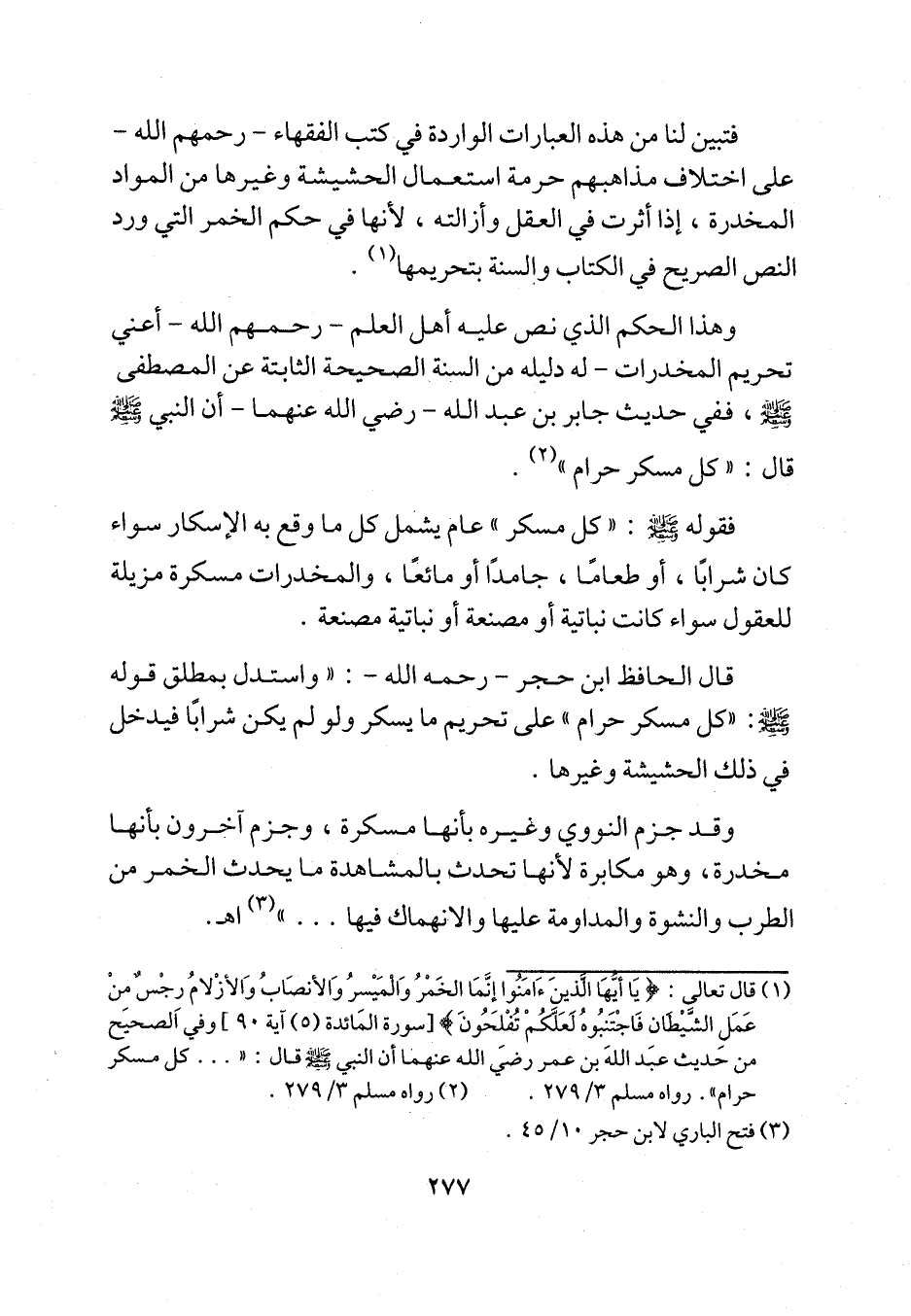 فتبين لنا من هذه العبارات الواردة في كتب الفقهاء -رحمهم الله- على اختلاف مذاهبهم حرمة استعمال الحشيشة وغيرها من المواد المخدرة، إذا أثرت في العقل وأزالته، لأنها في حكم الخمر التي ورد النص الصريح في الكتاب والسنة بتحريمها (¬1).