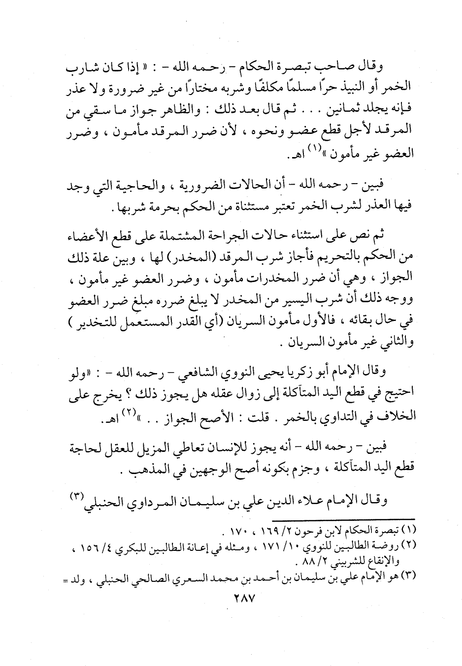 وقال صاحب تبصرة الحكام -رحمه الله-: "إذا كان شارب الخمر أو النبيذ حرًا مسلمًا مكلفًا وشربه مختارًا من غير ضرورة ولا عذر فإنه يجلد ثمانين ... ثم قال بعد ذلك: والظاهر جواز ما سقي من المرقد لأجل قطع عضو ونحوه، لأن ضرر المرقد مأمون، وضرر العضو غير مأمون" (¬1) اهـ.