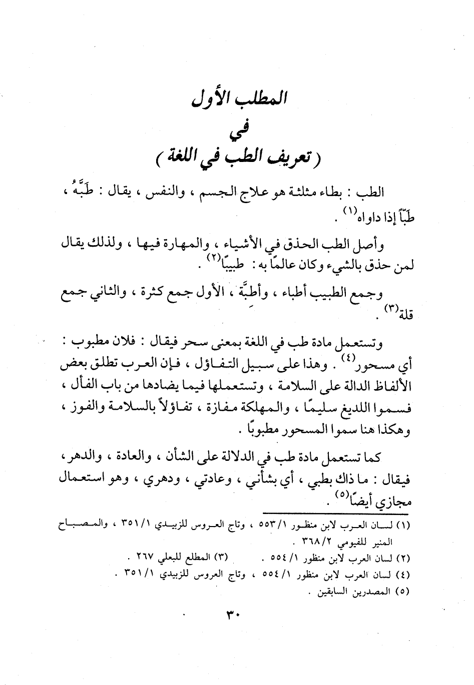 الطب: بطاء مثلثة هو علاج الجسم، والنفس، يقال: طَبَّهُ، طبّاً إذا داواه (¬1).