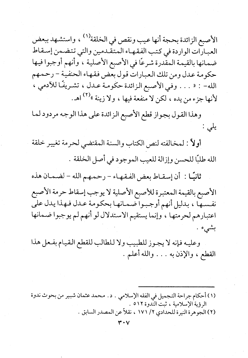 الأصبع الزائدة بحجة أنها عيب ونقص في الخلقة (¬1)، واستشهد ببعض العبارات الواردة في كتب الفقهاء المتقدمين والتي تتضمن إسقاط ضمانها بالقيمة المقدرة شرعًا في الأصبع الأصلية، وأنهم أوجبوا فيها حكومة عدل ومن تلك العبارات قول بعض فقهاء الحنفية -رحمهم الله-: " ... وفي الأصبع الزائدة حكومة عدل، تشريفًا للآدمي، لأنها جزء من يده، لكن لا منفعة فيها، ولا زينة" (¬2) اهـ.