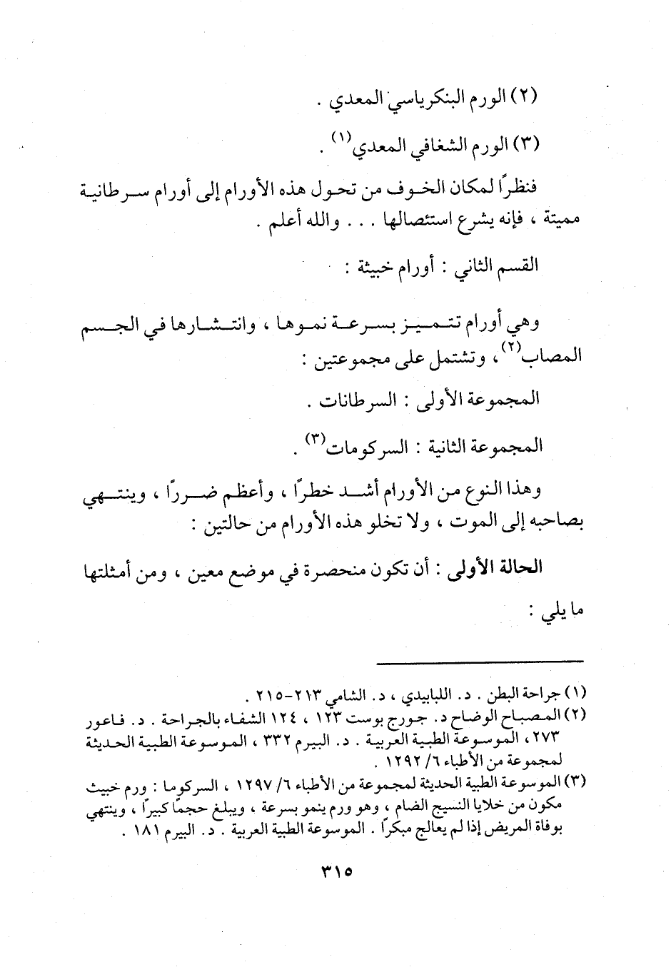 (¬3) الموسوعة الطبية الحديثة لمجموعة من الأطباء 6/ 1297، السركوما: ورم خبيث مكون من خلايا النسيج الضام، وهو ورم ينمو بسرعة، ويبلغ حجماً كبيرًا، وينتهي بوفاة المريض إذا لم يعالج مبكرًا. الموسوعة الطبية العربية. د. البيرم 181.