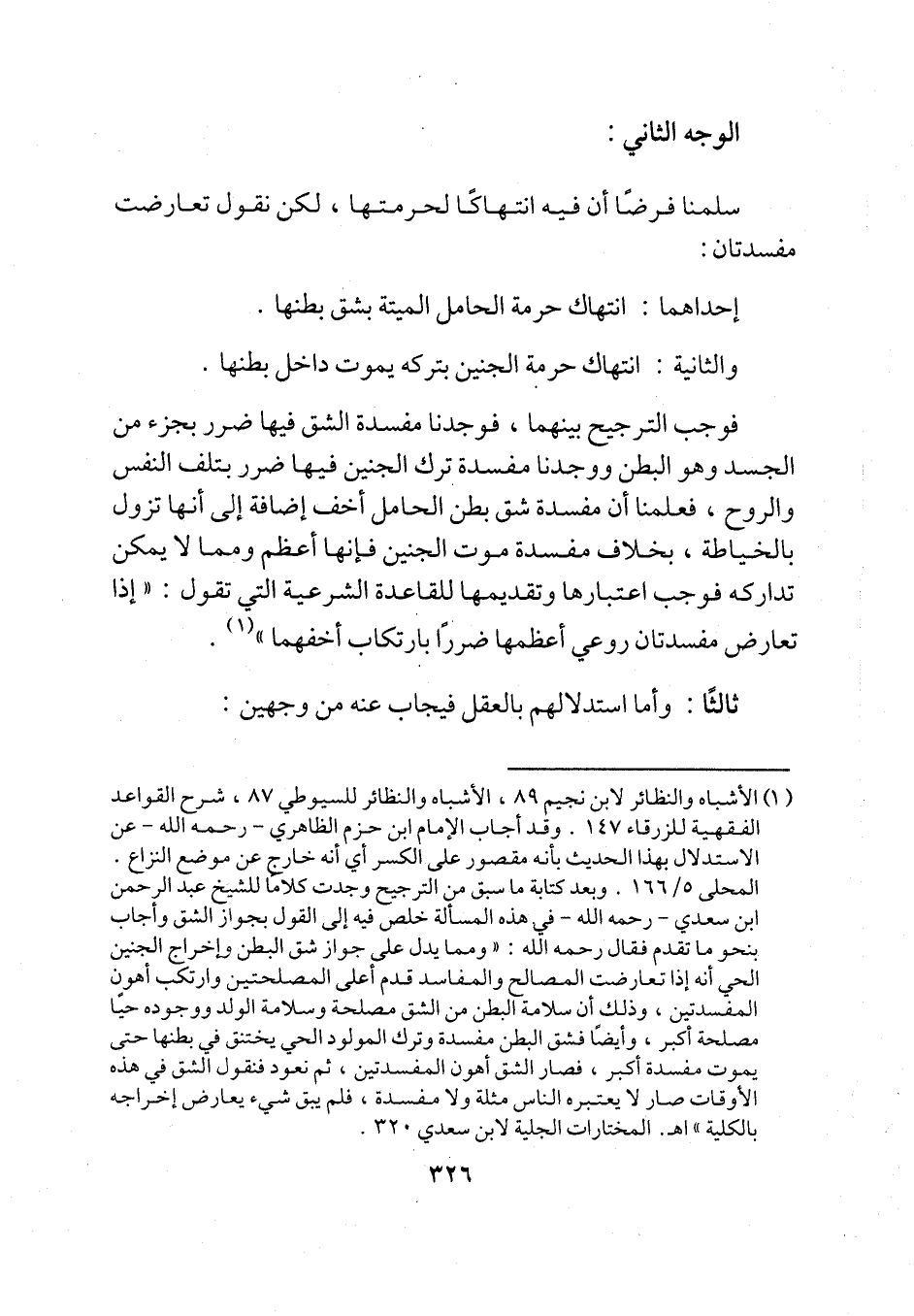 (¬1) الأشباه والنظائر لابن نجيم 89، الأشباه والنظائر للسيوطي 87، شرح القواعد الفقهية للزرقاء 147. وقد أجاب الإمام ابن حزم الظاهري -رحمه الله- عن الاستدلال بهذا الحديث بأنه مقصور على الكسر أي أنه خارج عن موضع النزاع. المحلى 5/ 166. وبعد كتابة ما سبق من الترجيح وجدت كلامًا للشيخ عبد الرحمن ابن سعدي -رحمه الله- في هذه المسألة خلص فيه إلى القول بجواز الشق وأجاب بنحو ما تقدم فقال رحمه الله: "ومما يدل على جواز شق البطن وإخراج الجنين الحي أنه إذا تعارضت المصالح والمفاسد قدم أعلى المصلحتين وارتكب أهون المفسدتين، وذلك أن سلامة البطن من الشق مصلحة وسلامة الولد ووجوده حيًا مصلحة أكبر، وأيضًا فشق البطن مفسدة وترك المولود الحي يختنق في بطنها حتى يموت مفسدة أكبر، فصار الشق أهون المفسدتين، ثم نعود فنقول الشق في هذه الأوقات صار لا يعتبره الناس مثلة ولا مفسدة، فلم يبق شيء يعارض إخراجه بالكلية" اهـ. المختارات الجلية لابن سعدي 320.