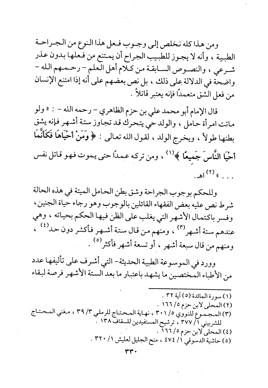 قال الإمام أبو محمد علي بن حزم الظاهري -رحمه الله-: "ولو ماتت امرأة حامل، والولد حي يتحرك قد تجاوز ستة أشهر فإنه يشق بطنها طولاً، ويخرج الولد، لقول الله تعالى: {وَمَنْ أحْيَاهَا فَكَأنَّمَا أحْيَا النَّاسَ جَمِيعًا} (¬1)، ومن تركه عمدًا حتى يموت فهو قاتل نفس ... " (¬2) اهـ.