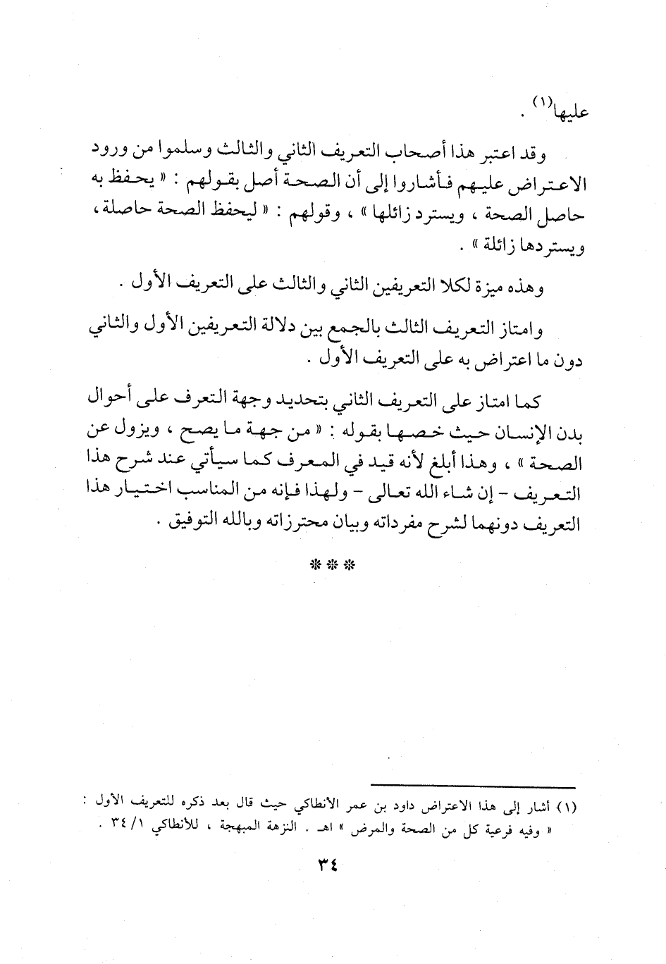 (¬1) أشار إلى هذا الاعتراض داود بن عمر الأنطاكي حيث قال بعد ذكره للتعريف الأول: "وفيه فرعية كل من الصحة والمرض" اهـ. النزهه المبهجة، للأنطاكي 1/ 34.