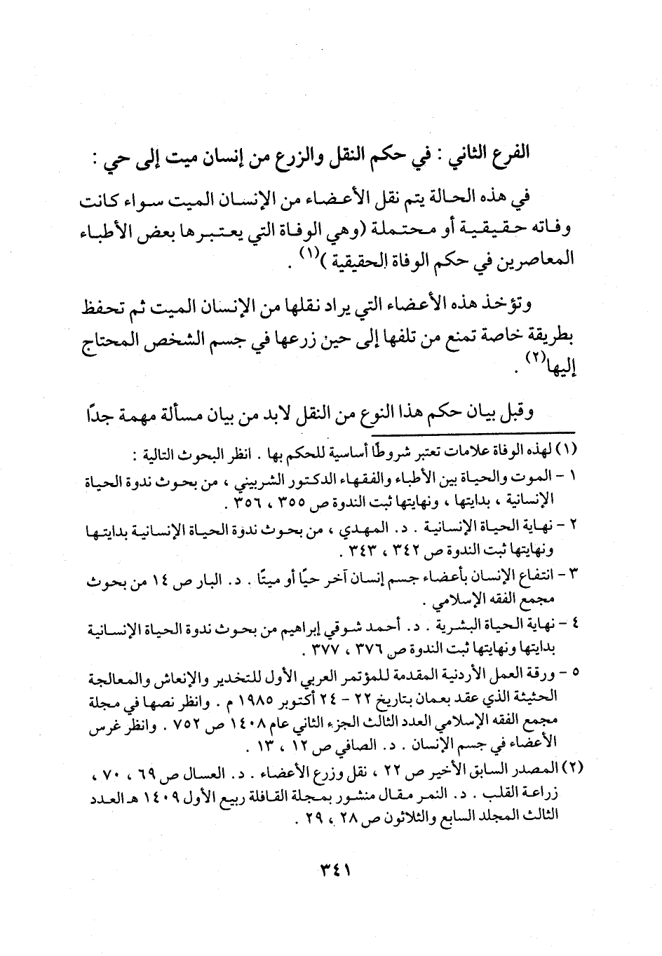 5 - ورقة العمل الأردنية المقدمة للمؤتمر العربي الأول للتخدير والإنعاش والمعالجة الحثيثة الذي عقد بعمان بتاريخ 22 - 24 أكتوبر 1985 م. وانظر نصها في مجلة مجمع الفقه الإسلامي العدد الثالث الجزء الثاني عام 1408 ص 752. وانظر غرس الأعضاء في جسم الإنسان. د. الصافي ص 12، 13.