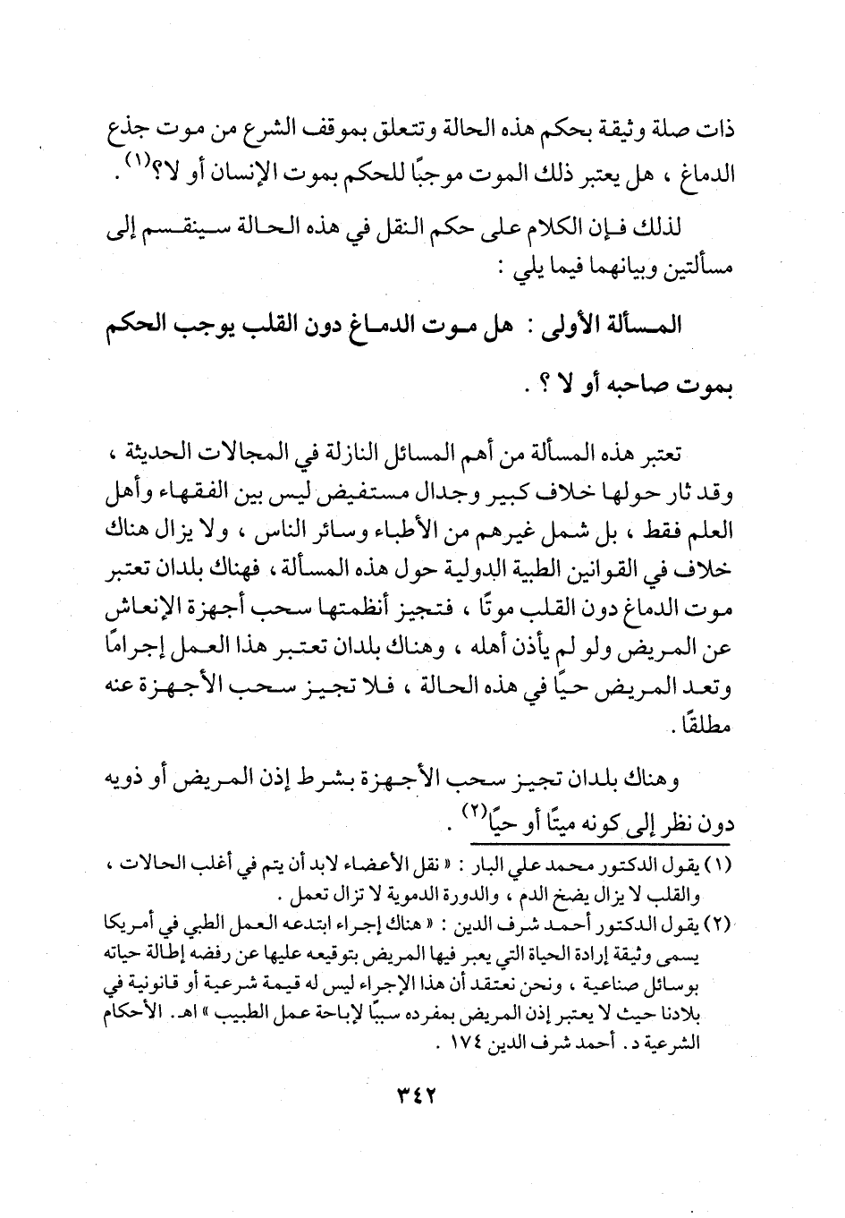 تعتبر هذه المسألة من أهم المسائل النازلة في المجالات الحديثة، وقد ثار حولها خلاف كبير وجدال مستفيض ليس بين الفقهاء وأهل العلم فقط، بل شمل غيرهم من الأطباء وسائر الناس، ولا يزال هناك خلاف في القوانين الطبية الدولية حول هذه المسألة، فهناك بلدان تعتبر موت الدماغ دون القلب موتًا، فتجيز أنظمتها سحب أجهزة الإنعاش عن المريض ولو لم يأذن أهله، وهناك بلدان تعتبر هذا العمل إجرامًا وتعد المريض حيًا في هذه الحالة، فلا تجيز سحب الأجهزة عنه مطلقًا.