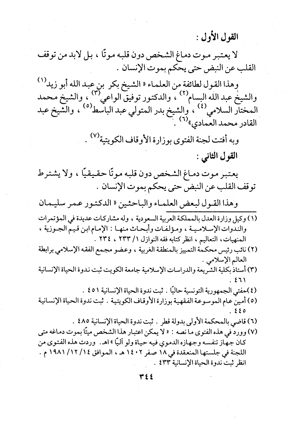 (¬7) وورد في هذه الفتوى ما نصه: "لا يمكن اعتبار هذا الشخص ميتًا بموت دماغه متى كان جهاز تنفسه وجهازه الدموي فيه حياة ولو آليًا" اهـ. وردت هذه الفتوى من اللجنة في جلستها المنعقدة في 18 صفر 1402 هـ، الموافق 14/ 12/1981 م. انظر ثبت ندوة الحياة الإنسانية 433.