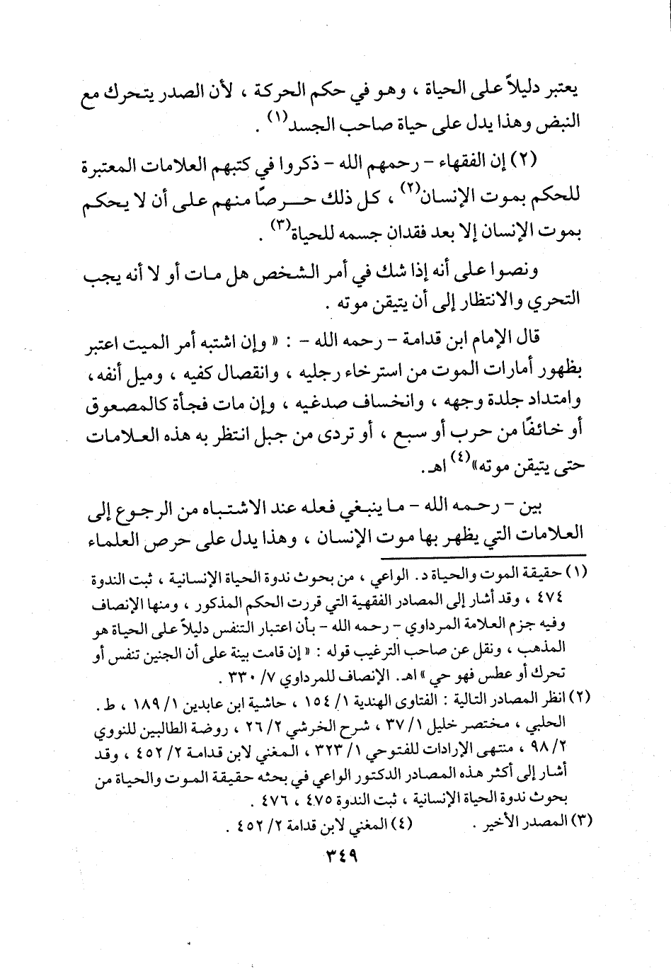 (2) إن الفقهاء -رحمهم الله- ذكروا في كتبهم العلامات المعتبرة للحكم بموت الإنسان (¬2)، كل ذلك حرصًا منهم على أن لا يحكم بموت الإنسان إلا بعد فقدان جسمه للحياة (¬3).