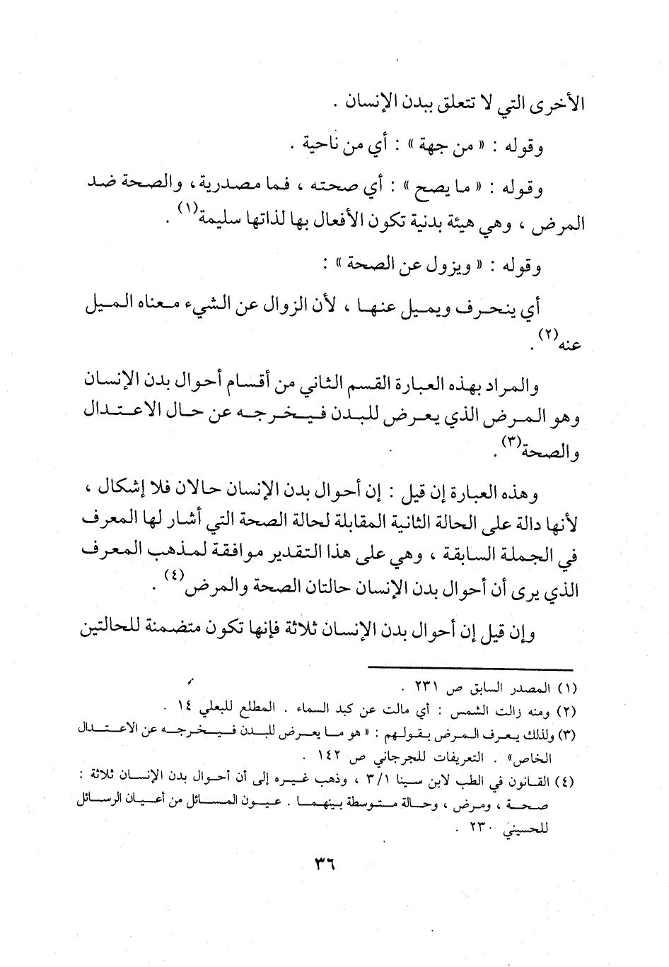 وهذه العبارة إن قيل: إن أحوال بدن الإنسان حالان فلا إشكال، لأنها دالة على الحالة الثانية المقابلة لحالة الصحة التي أشار لها المعرف في الجملة السابقة، وهي على هذا التقدير موافقة لمذهب المعرف الذي يرى أن أحوال بدن الإنسان حالتان الصحة والمرض (¬4).