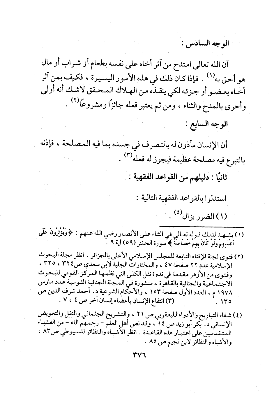(¬4) شفاء التباريح والأدواء لليعقوبي ص 21، والتشريح الجثماني والنقل والتعويض الإنساني د. بكر أبو زيد ص 14، وقد نص أهل العلم -رحمهم الله- من الفقهاء المتقدمين على اعتبار هذه القاعدة. انظر الأشباه والنظائر للسيوطي ص 83، والأشباه والنظائر لابن نجيم ص 85.