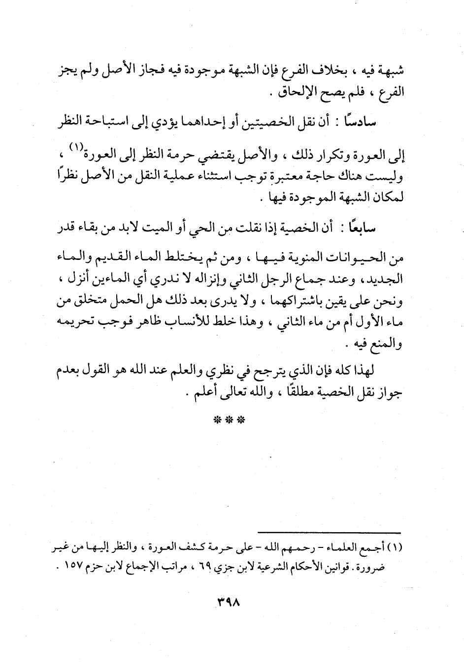 سادسًا: أن نقل الخصيتين أو إحداهما يؤدي إلى استباحة النظر إلى العورة وتكرار ذلك، والأصل يقتضي حرمة النظر إلى العورة (¬1)، وليست هناك حاجة معتبرة توجب استثناء عملية النقل من الأصل نظرًا لمكان الشبهة الموجودة فيها.