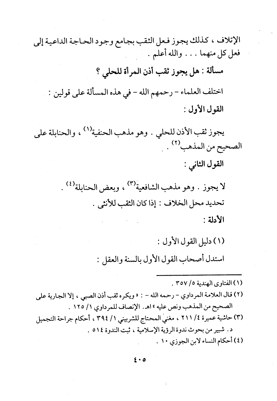 الإتلاف، كذلك يجوز فعل الثقب بجامع وجود الحاجة الداعية إلى فعل كل منهما ... والله أعلم.
