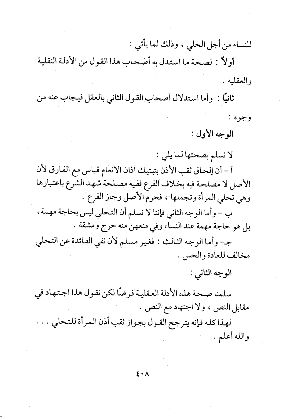 جـ- وأما الوجه الثالث: فغير مسلم لأن نفي الفائدة عن التحلي مخالف للعادة والحس.