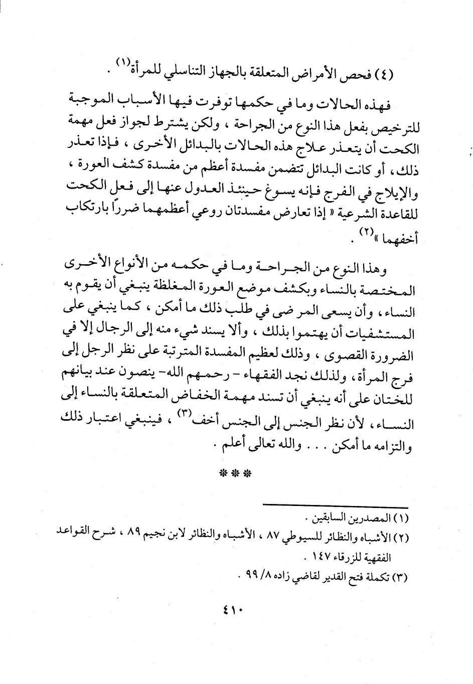 وهذا النوع من الجراحة وما في حكمه من الأنواع الأخرى المختصة بالنساء وبكشف موضع العورة المغلظة ينبغي أن يقوم به النساء، وأن يسعى المرضى في طلب ذلك ما أمكن، كما ينبغي على المستشفيات أن يهتموا بذلك، وألا يسند شيء منه إلى الرجال إلا في الضرورة القصوى، وذلك لعظيم المفسدة المترتبة على نظر الرجل إلى فرج المرأة، ولذلك نجد الفقهاء -رحمهم الله- ينصون عند بيانهم للختان على أنه ينبغي أن تسند مهمة الخفاض المتعلقة بالنساء إلى النساء، لأن نظر الجنس إلى الجنس أخف (¬3)، فينبغي اعتبار ذلك والتزامه ما أمكن ... والله تعالى أعلم.