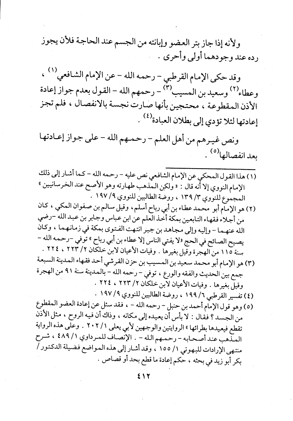 وقد حكى الإمام القرطبي -رحمه الله- عن الإمام الشافعي (¬1)، وعطاء (¬2) وسعيد بن المسيب (¬3) -رحمهم الله- القول بعدم جواز إعادة الأذن المقطوعة، محتجين بأنها صارت نجسة بالانفصال، فلم تجز إعادتها لئلا تؤدي إلى بطلان العبادة (¬4).
