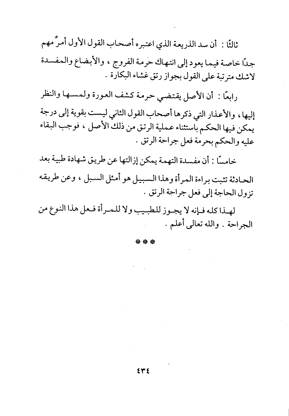 رابعًا: أن الأصل يقتضي حرمة كشف العورة ولمسها والنظر إليها، والأعذار التي ذكرها أصحاب القول الثاني ليست بقوية إلى درجة يمكن فيها الحكم باستثناء عملية الرتق من ذلك الأصل، فوجب البقاء عليه والحكم بحرمة فعل جراحة الرتق.