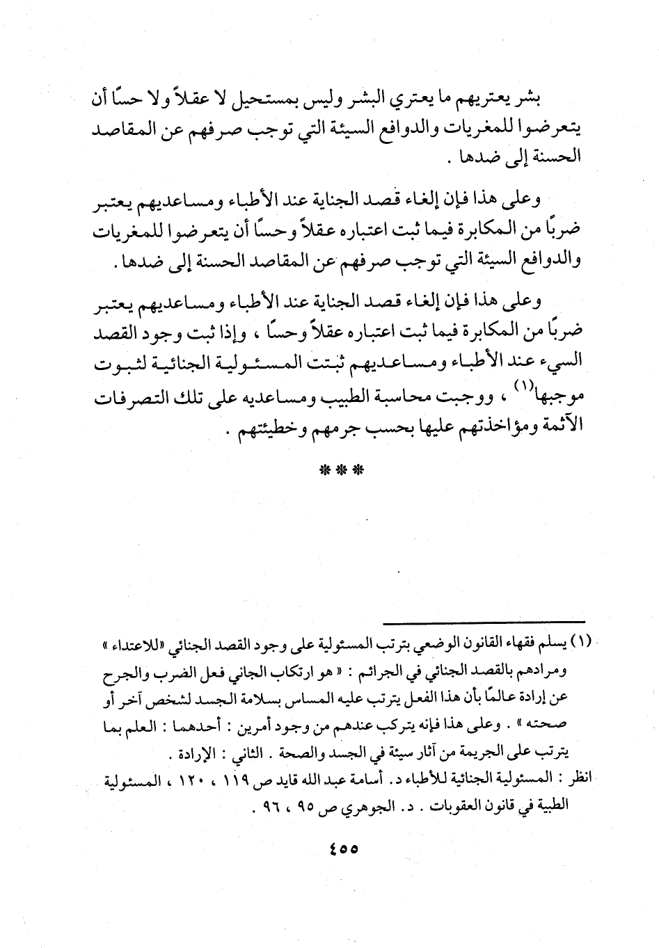 وعلى هذا فإن إلغاء قصد الجناية عند الأطباء ومساعديهم يعتبر ضربًا من المكابرة فيما ثبت اعتباره عقلاً وحسًا أن يتعرضوا للمغريات والدوافع السيئة التي توجب صرفهم عن المقاصد الحسنة إلى ضدها.