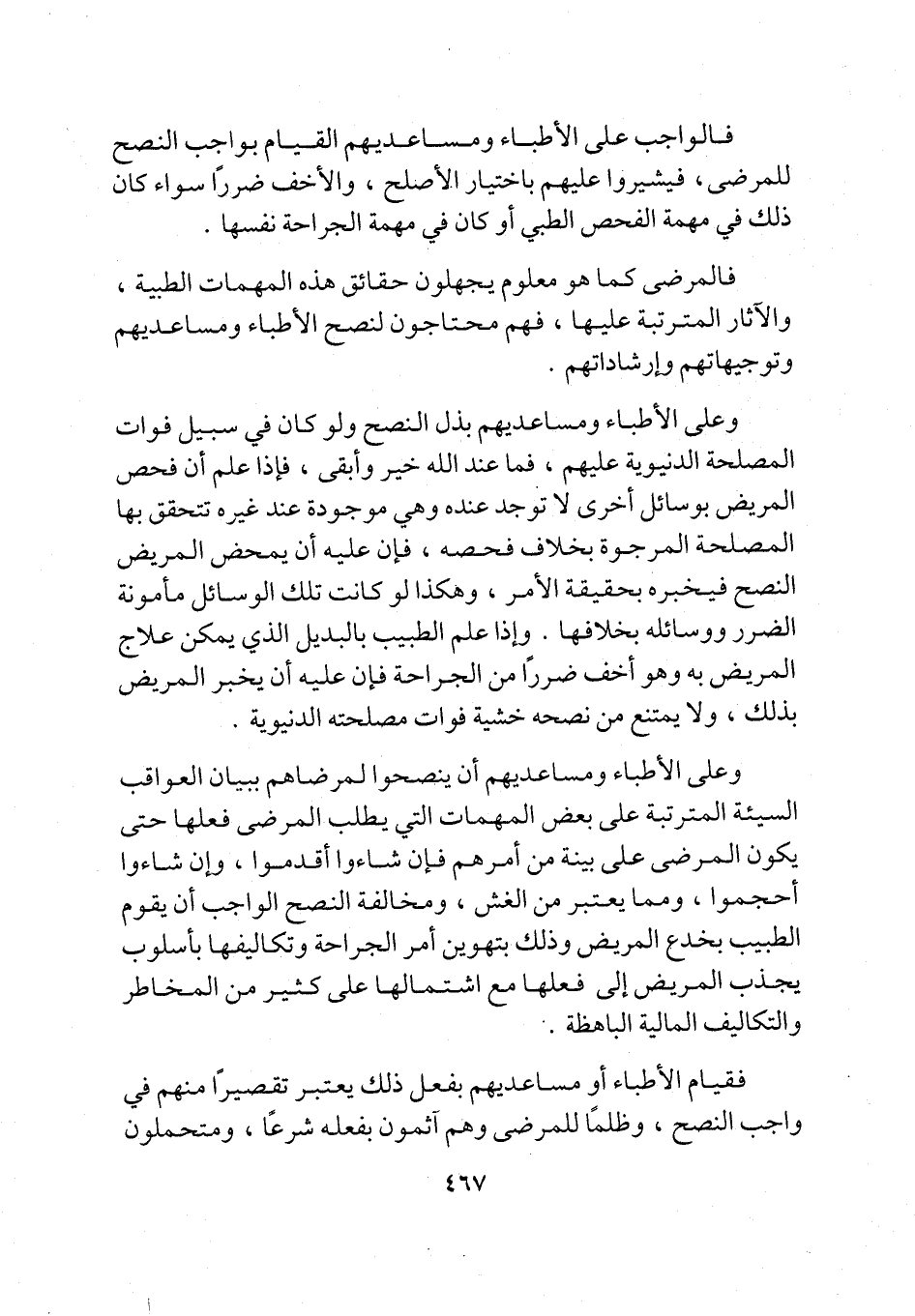 فالواجب على الأطباء ومساعديهم القيام بواجب النصح للمرضى، فيشيروا عليهم باختيار الأصلح، والأخف ضررًا سواء كان ذلك في مهمة الفحص الطبي أو كان في مهمة الجراحة نفسها.