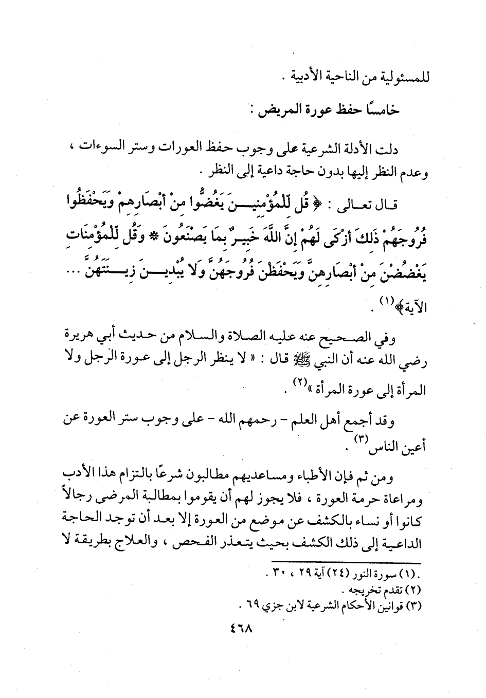 ومن ثم فإن الأطباء ومساعديهم مطالبون شرعًا بالتزام هذا الأدب ومراعاة حرمة العورة، فلا يجوز لهم أن يقوموا بمطالبة المرضى رجالاً كانوا أو نساء بالكشف عن موضع من العورة إلا بعد أن توجد الحاجة الداعية إلى ذلك الكشف بحيث يتعذر الفحص، والعلاج بطريقة لا